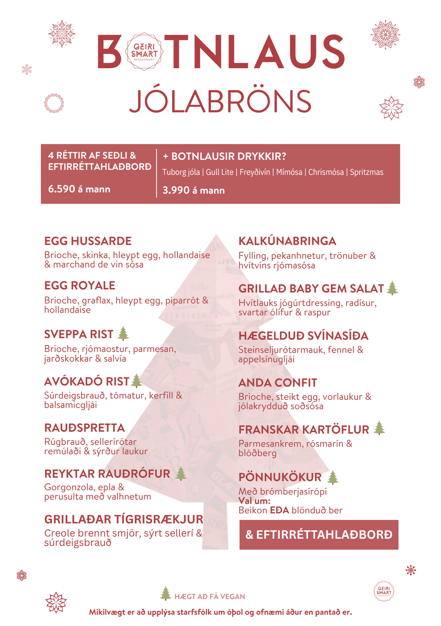 Til í eitthvað meira fullorðins á aðventunni? Komdu í botnlausan jólabröns Geira Smart, jólaðu mímósuna upp og njóttu jólalegra rétta með þínu besta fólki. Bókaðu borð í hátíðlegan jólabröns, alla laugardaga og sunnudaga frá og með 15. nóvember.